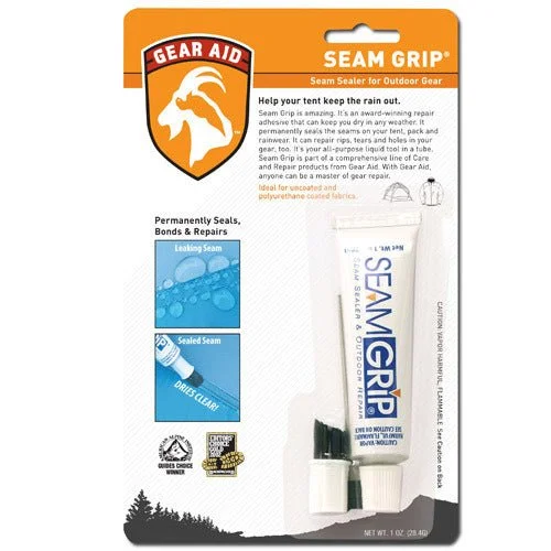 Seam Grip® by Gear Aid® is a gear repair kit in a tube. Use it as a tent seam sealer, sleeping pad fixer or equipment rebuilder. Works on all types of fabrics and surfaces, including neoprene, PVC, rubber, leather, vinyl and synthetics.