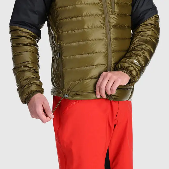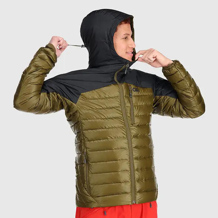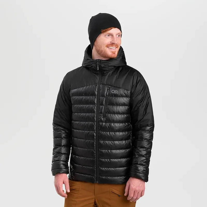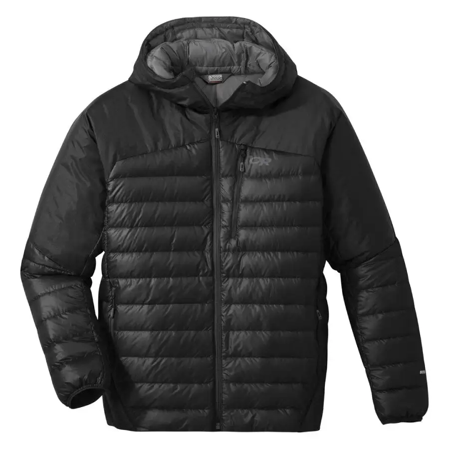 The Outdoor Research Men’s Helium Down Hoodie is a technical outerwear piece that provides the lightweight, packable warmth of down with innovative, hybrid fabrication to deliver better weather protection than traditional insulated hooded jackets.